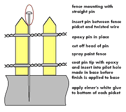 If you are adding a prebuilt fence like we did, spraypaint the fence with brown paint (or rust primer, if you want to give it a "snow fence" look). Then when it has dried, use straight pins to fasten the fence to the base as shown in the drawing to the right. (Click on the drawing for a bigger picture.)